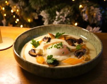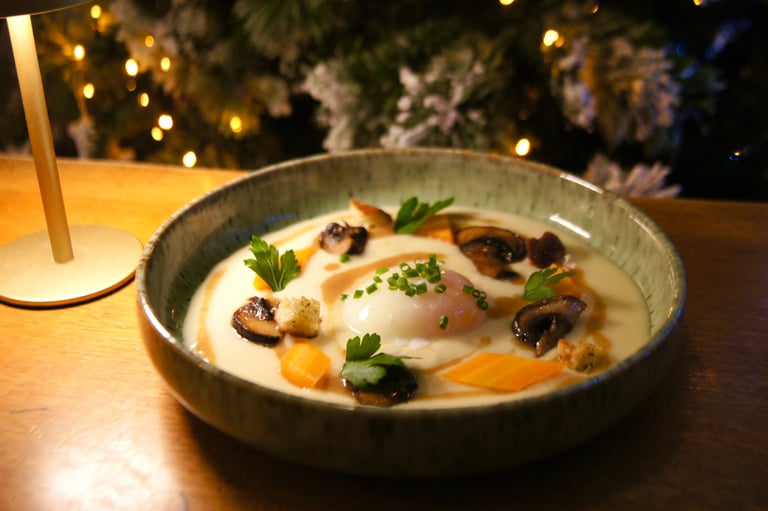 Œuf parfait, poêlée de champignons à la crème de blanquette, jus corsé et carottes, croûtons.