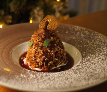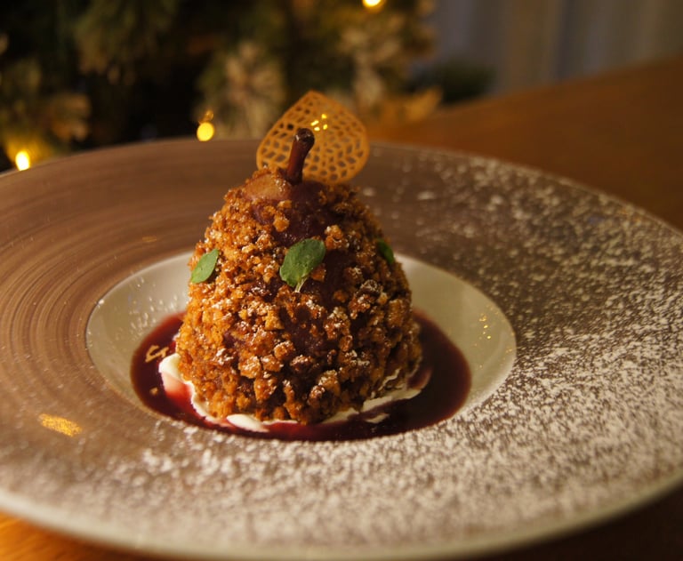 Poire pochée au vin chaud, enrobée de pain d’épices croustillant, chantilly.