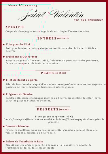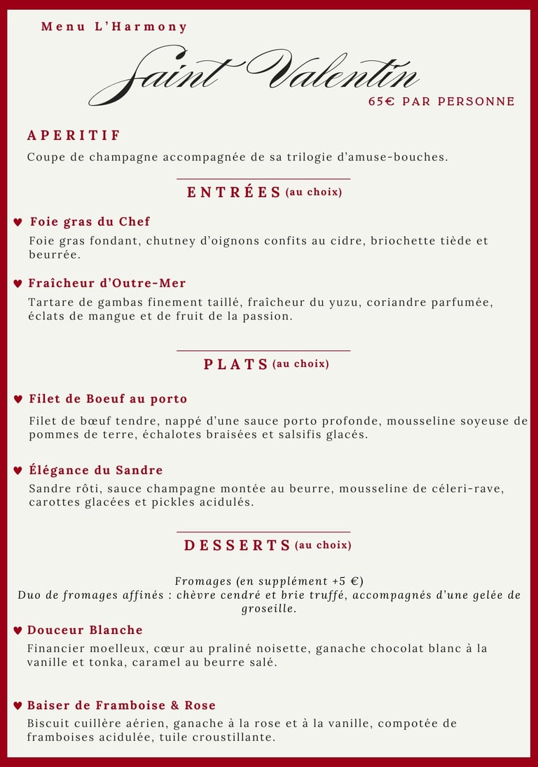 À l’occasion de la Saint-Valentin,notre chef vous propose un menu raffiné, imaginé pour sublimer un moment de partage et de gourmandise.